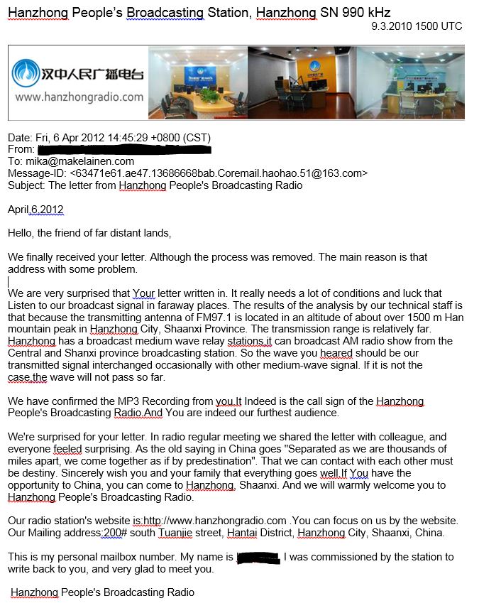 Si ya lograste identificar lo que captaste, quizás quieras considerar enviarle a la emisora un informe de recepción. El DXing sigue siendo prácticamente desconocido en China como pasatiempo, así que contactar a emisoras de radio chinas puede convertirse en una experiencia fascinante. Mis informes de recepción a emisoras chinas han resultado, a lo largo de los años, en numerosos artículos en los medios chinos locales y nacionales. Muchas emisoras se emocionan al saber de oyentes en el extranjero, pero, por otro lado, recibir una respuesta suele ser difícil.